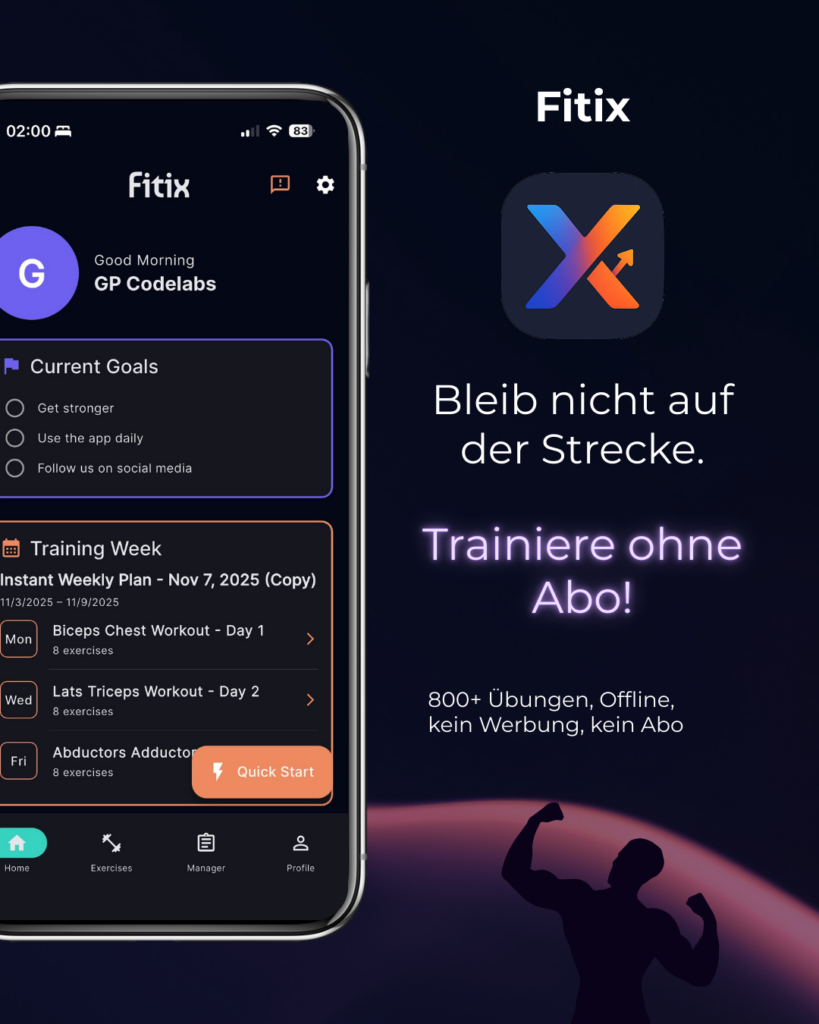 Fitix ist dein strukturierter Fitness-Tracker für Krafttraining, Trainingsplanung und Fortschrittsanalyse. Ohne Werbung, ohne verpflichtendes Konto und ohne dauerhafte Abos.
