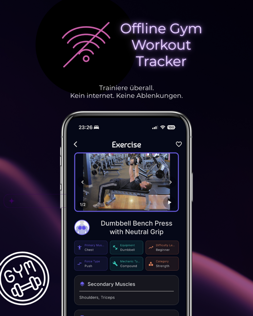 Du kannst die App vollständig ohne Internet nutzen. Ideal für das Fitnessstudio.